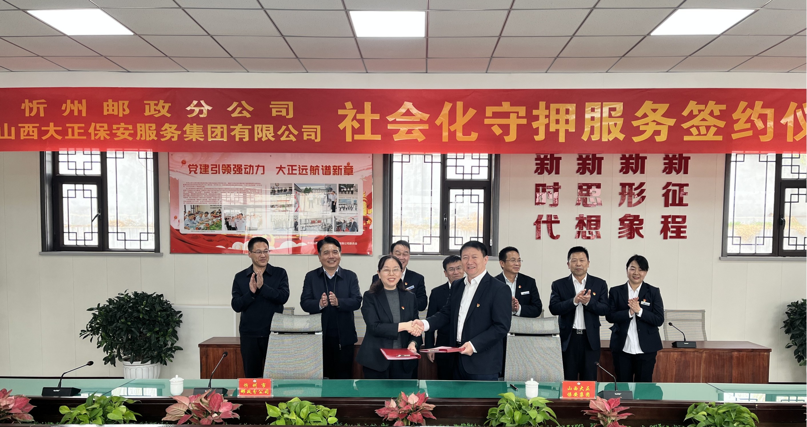 中國郵政集團忻州市分公司黨委委員、副總經(jīng)理高茂懷,安保部主任李靜宇;山西大正保安集團黨委委員邢春生,董事、正大物業(yè)公司總經(jīng)理呂雙明,總經(jīng)理助理羅鵬生、宋林兔,守押綜合部主任韓美芳出席簽約儀式。