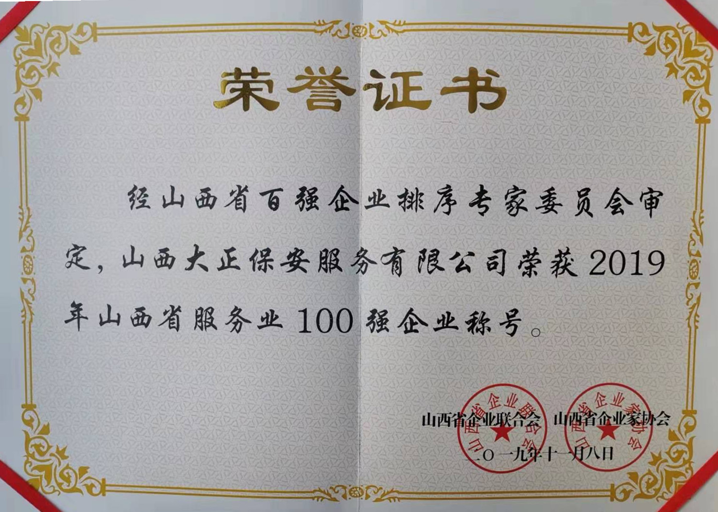 11月8日,2019山西企業(yè)100強(qiáng)在省城太原發(fā)布。經(jīng)山西省百?gòu)?qiáng)企業(yè)排序?qū)<椅瘑T會(huì)審定,山西大正保安服務(wù)有限公司再次榮獲“山西省服務(wù)業(yè)100強(qiáng)企業(yè)”,這是該公司自2014年以來(lái)連續(xù)五次榮登該榜。公司黨委副書(shū)記、副總經(jīng)理陳志平前往參會(huì)。